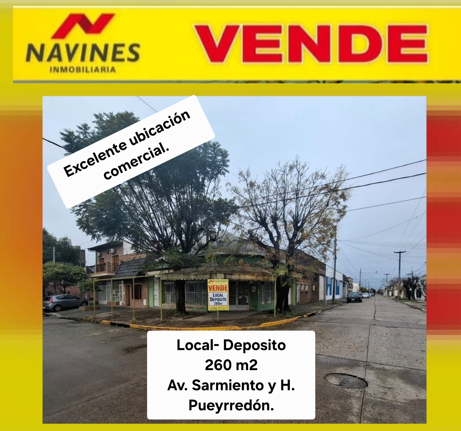 Excelente local comercial y deposito, ubicado en la interseccion de Av. Sarmiento y H. Pueyrredon de la Ciudad de San Pedro. 260 m2 cubiertos, aptos para diferentes destinos comerciales.